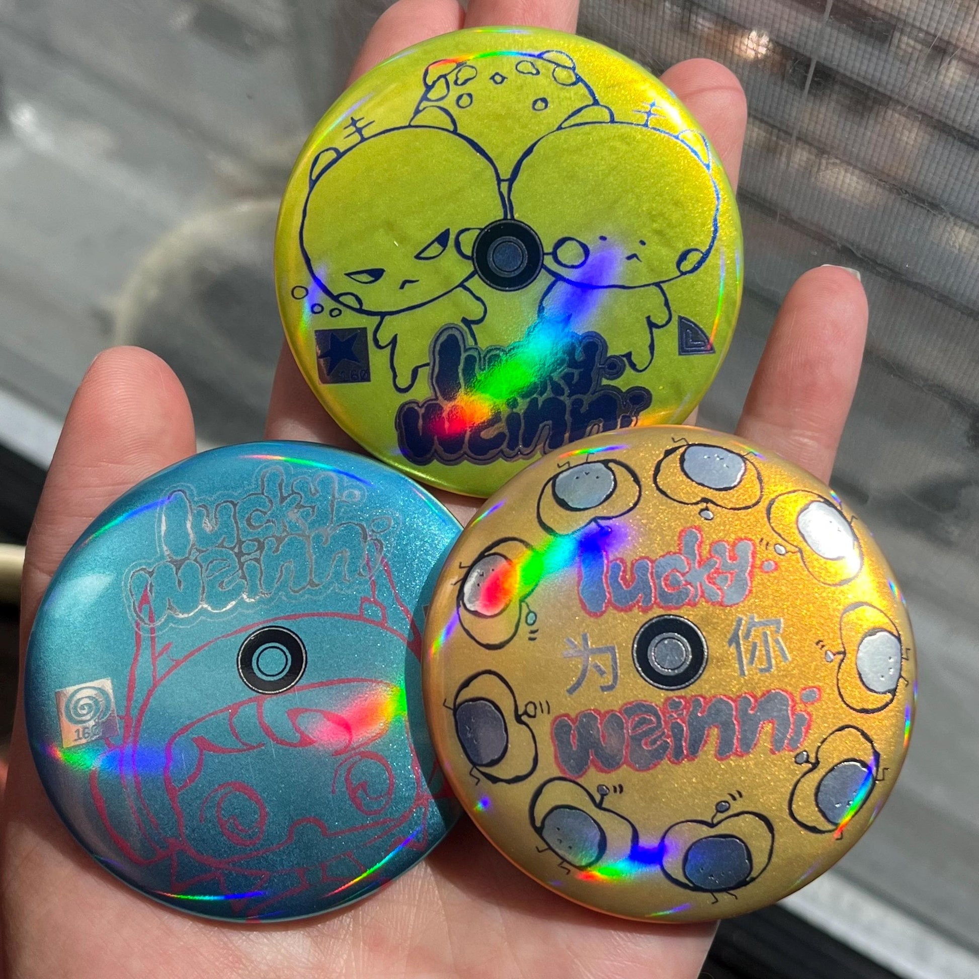 Lucky Weinni button pins featuring Lucky Weinni mascots. Iridescent and shiny, made to seem like a CD. 58mm in diameter. These are bright and iridescent, even in the shade.