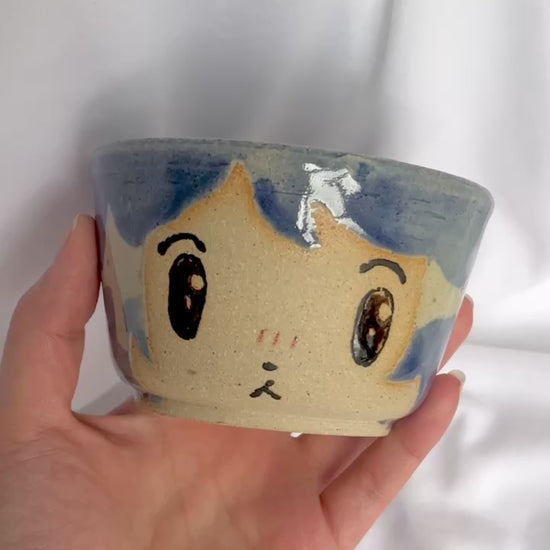 Glazed everywhere but the face, leaving a textural difference. Blue hair with brown eyes, with a halo effect on the hair.