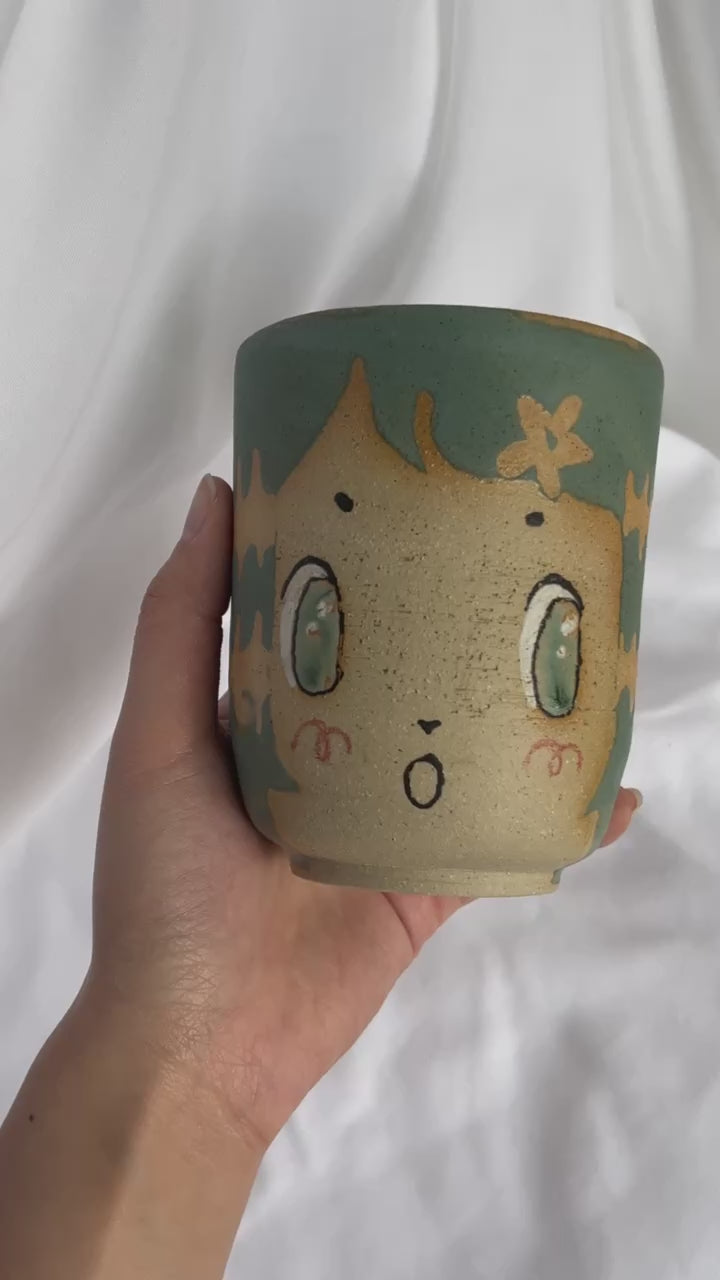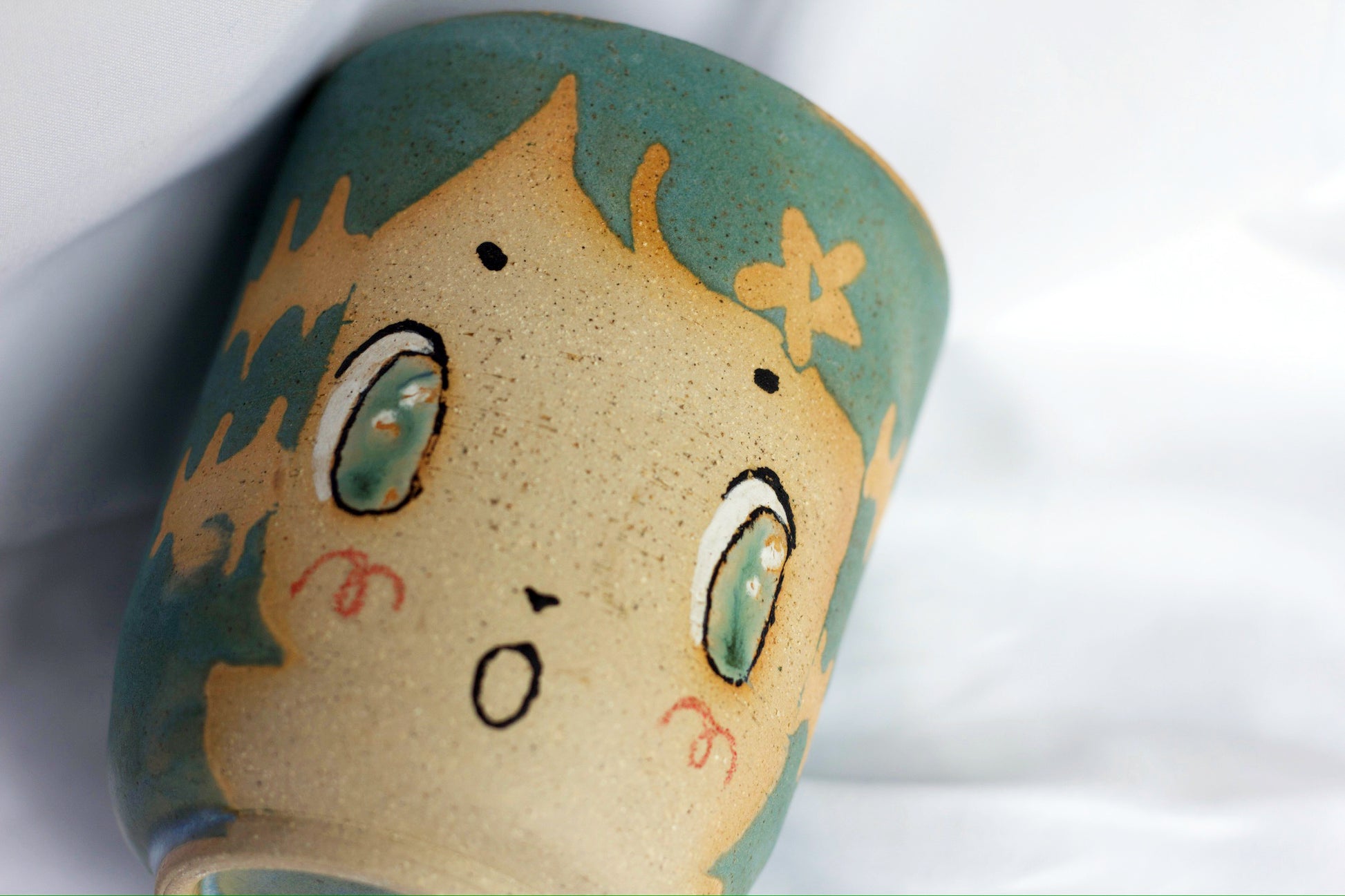 Glazed everywhere but the face, leaving a textural difference. Blue hair with brown eyes, with a halo effect on the hair. Spots of patchiness on exterior due to unexpected glaze outcome.