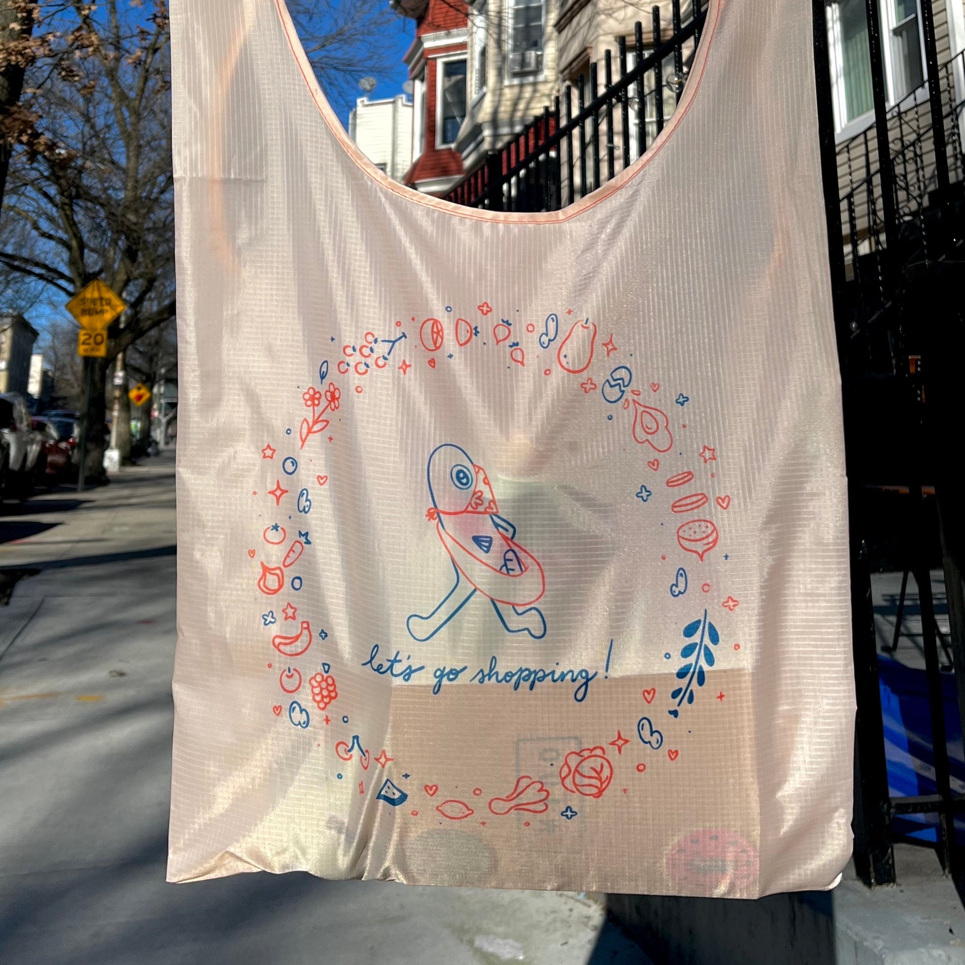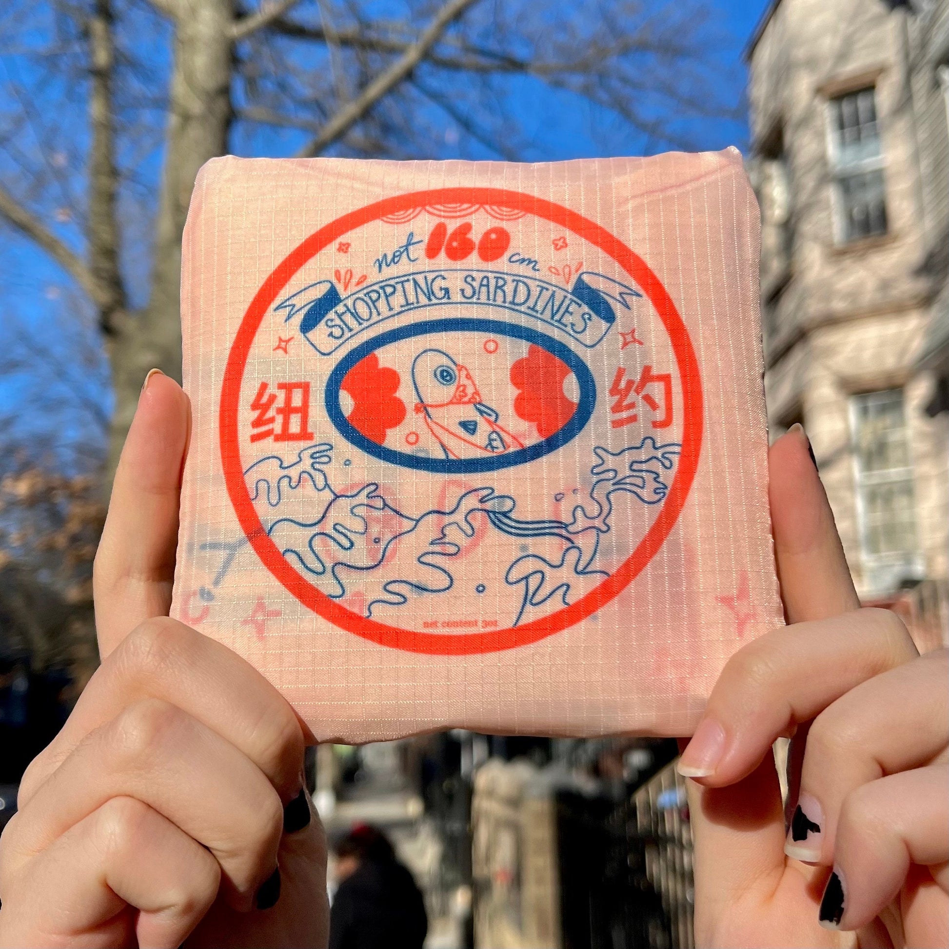 Nylon reusable bag that folds into a pouch inspired by sardine tins. Peachy bag with red stitching and pink and blue design. Holds 45 lbs