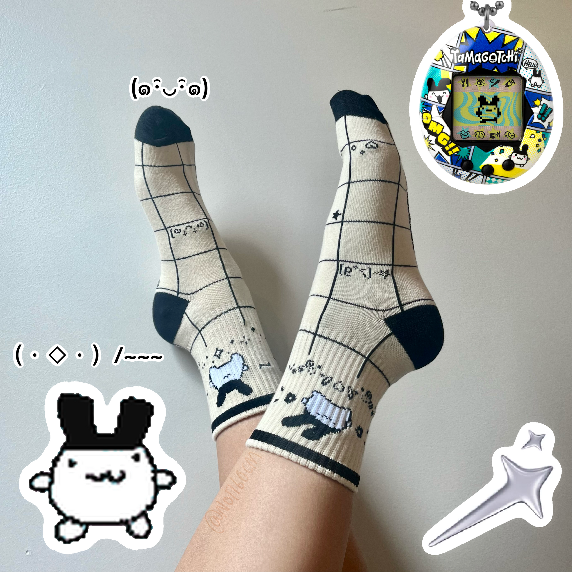 Double sided off-white socks with black toe and heel accents featuring Memetchi from Tamagotchi. 100% cotton.
